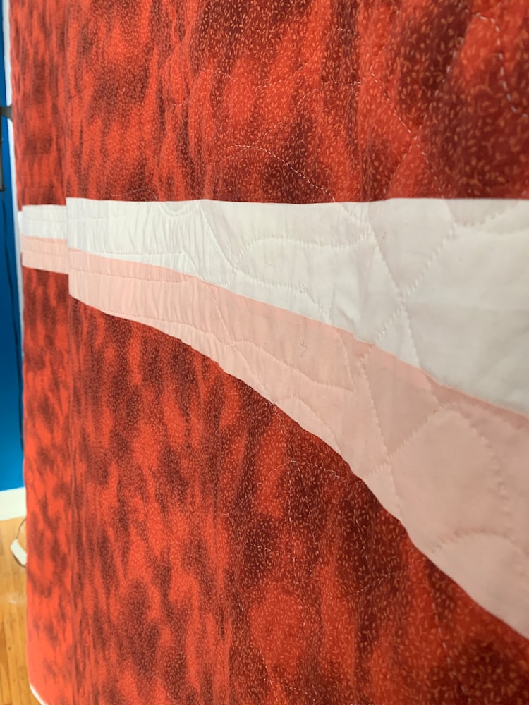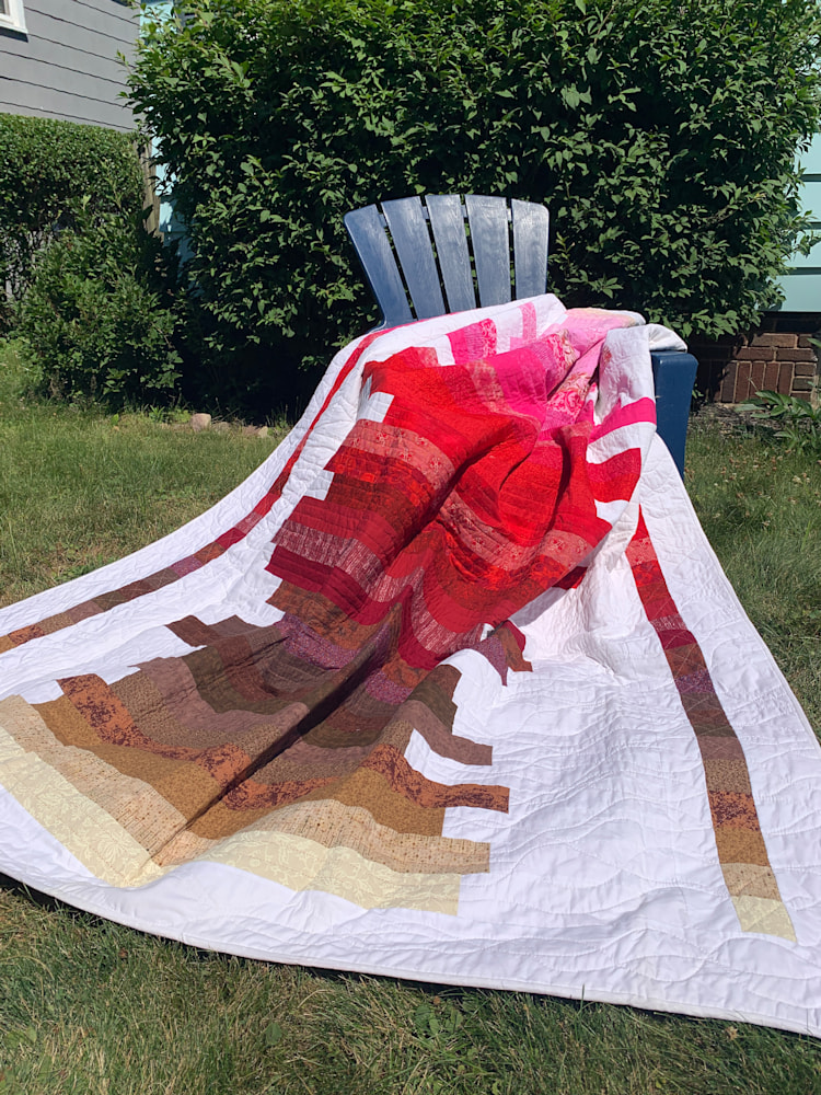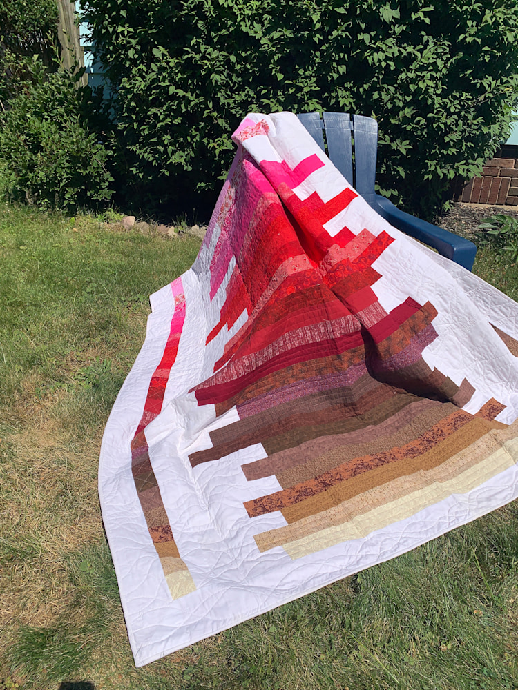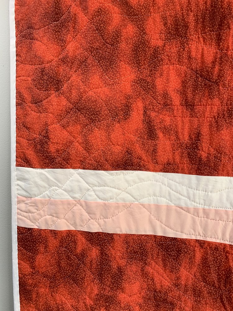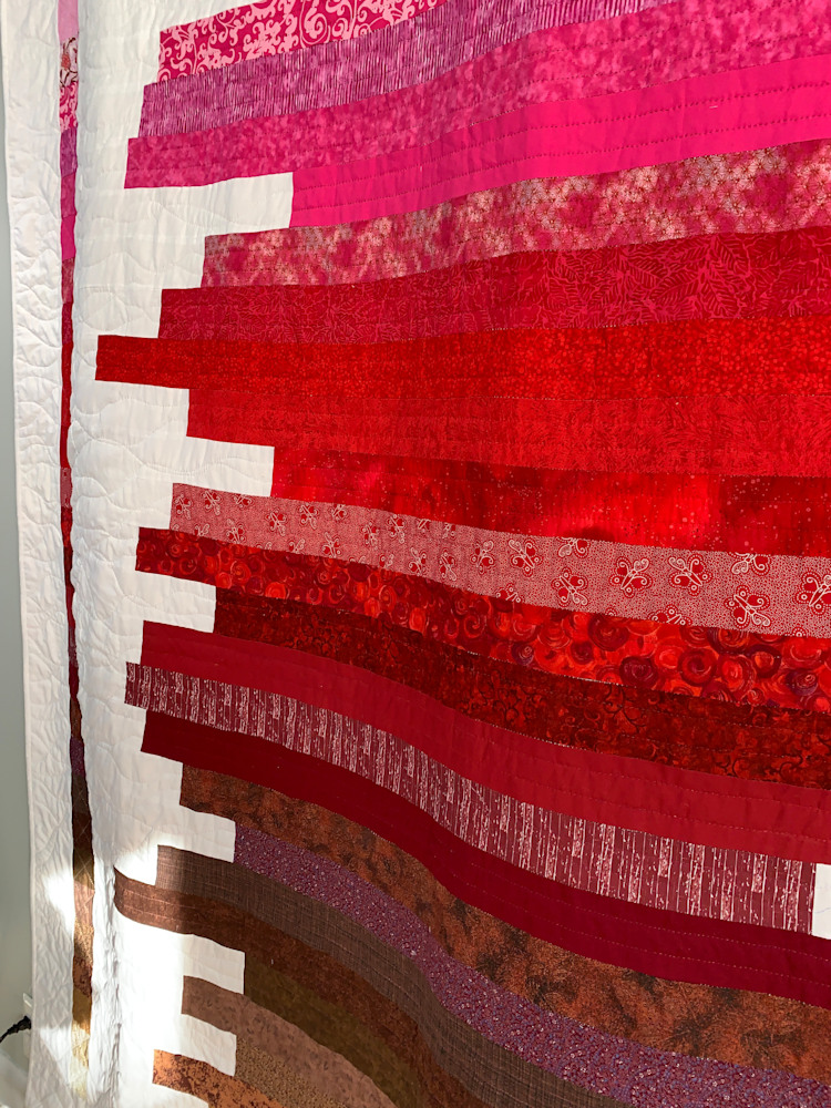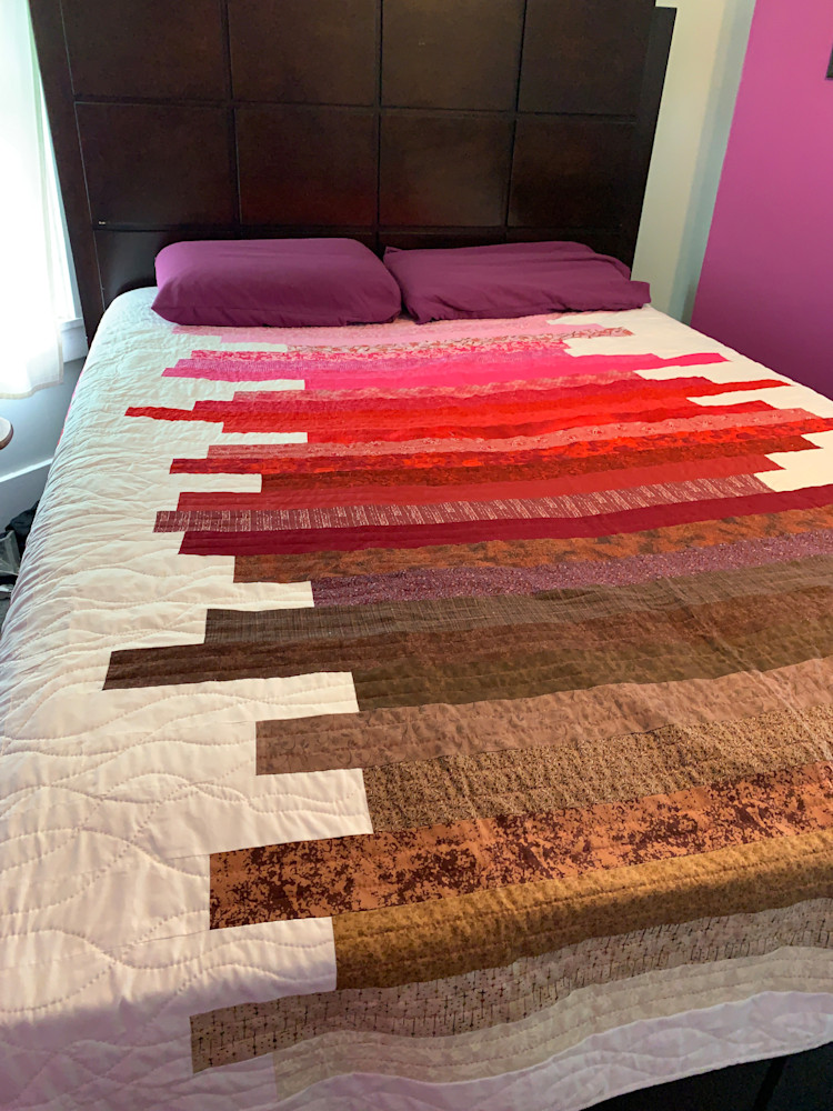 At 76x90, this hand-quilted quilt is perfect for a king or a queen-sized bed, and will keep you warm all winter long. The quilting is structured in the color bars and coordinating end cap squares, while it is free-flowing and organic in the white background. The strong palette will liven up any room and is sure to become a family favorite.