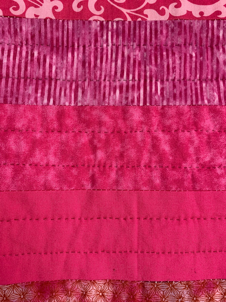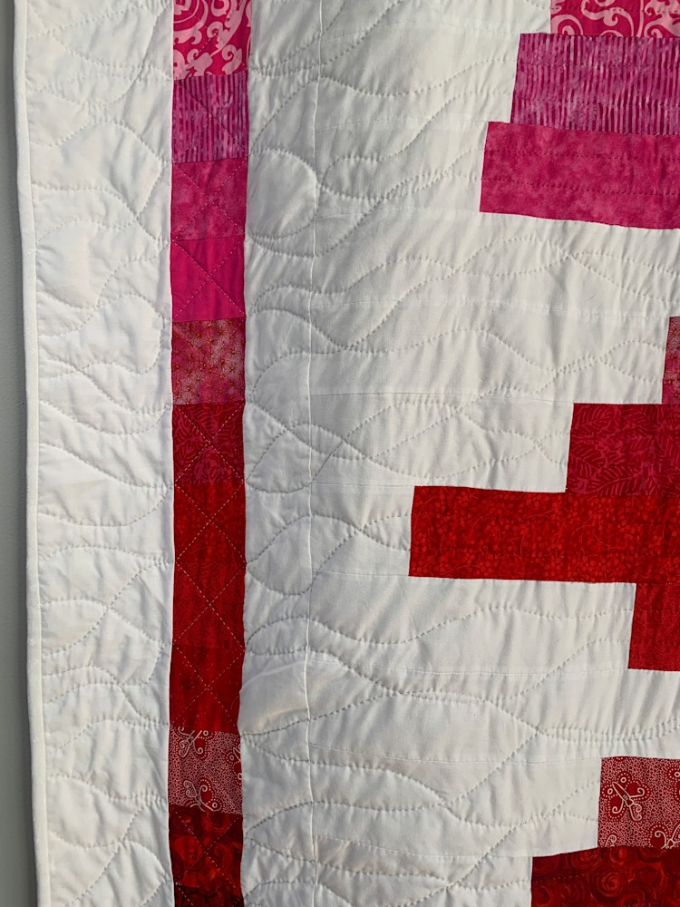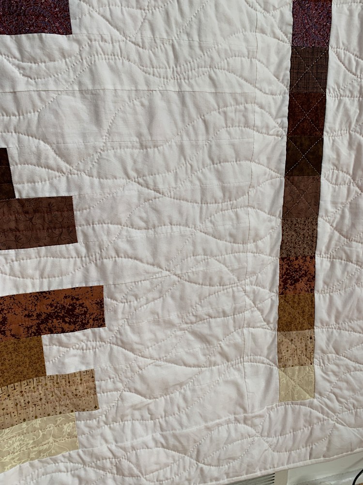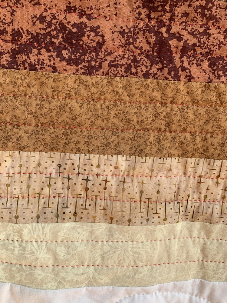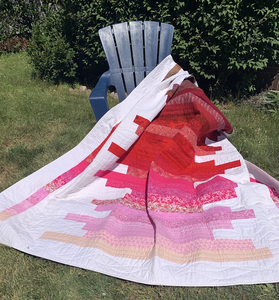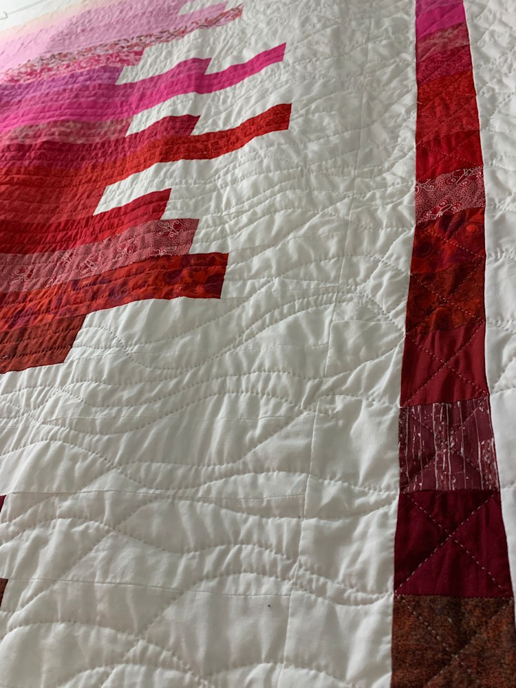 At 76x90, this hand-quilted quilt is perfect for a king or a queen-sized bed, and will keep you warm all winter long. The quilting is structured in the color bars and coordinating end cap squares, while it is free-flowing and organic in the white background. The strong palette will liven up any room and is sure to become a family favorite.