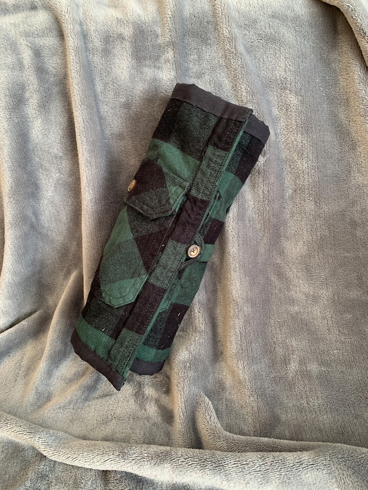 I love details in clothing, and I often use every part and piece of the clothing item to accent the final roll-up case, adding function and character to it. This is super-handy, and a perfect way to repurpose your most loved clothing. I take extra care to include the fine details of the garment in the roll-up case to personalize it the best I can. I like to incorporate every feature I can fit in, including extra pockets, custom straps, and unique details, utilizing every piece and part of the garment to create a special and distinctive item. I've included photos of some examples to give you an idea of what to expect from a completed case.